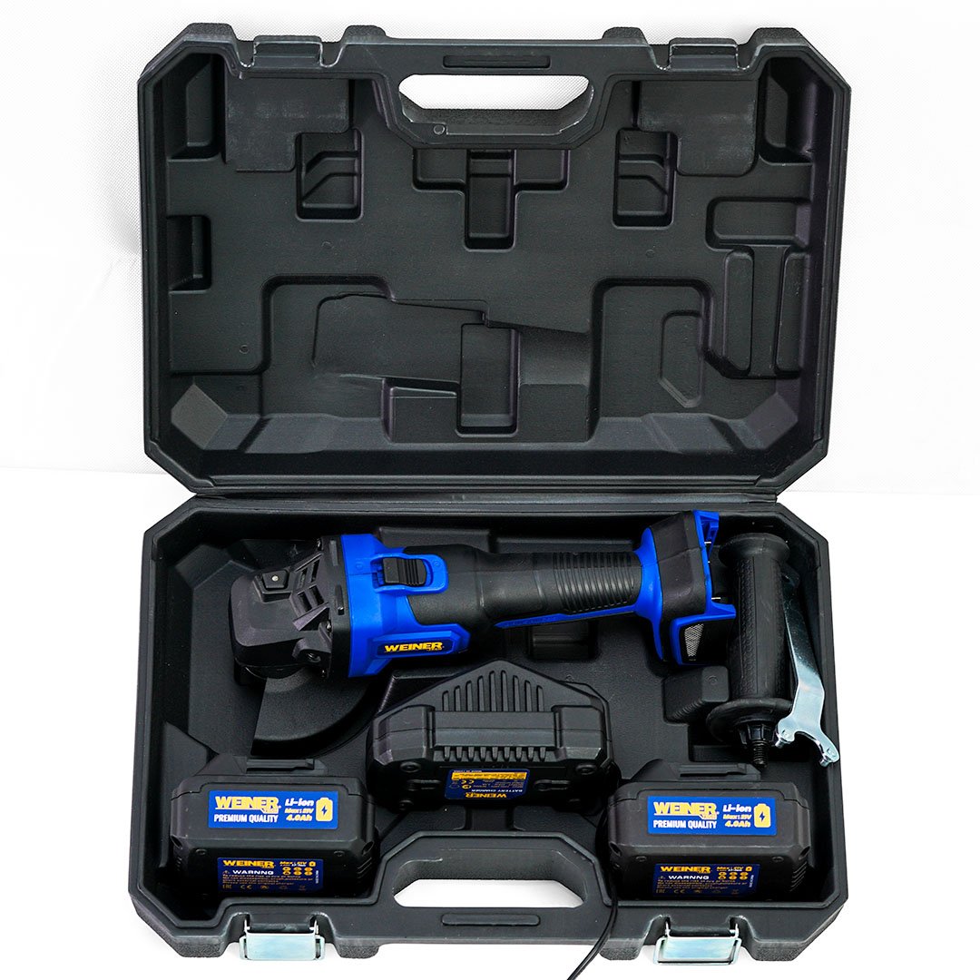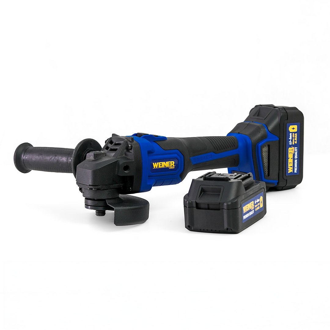 Premium quality cordless angle grinder from WEINER tech, equipped with a