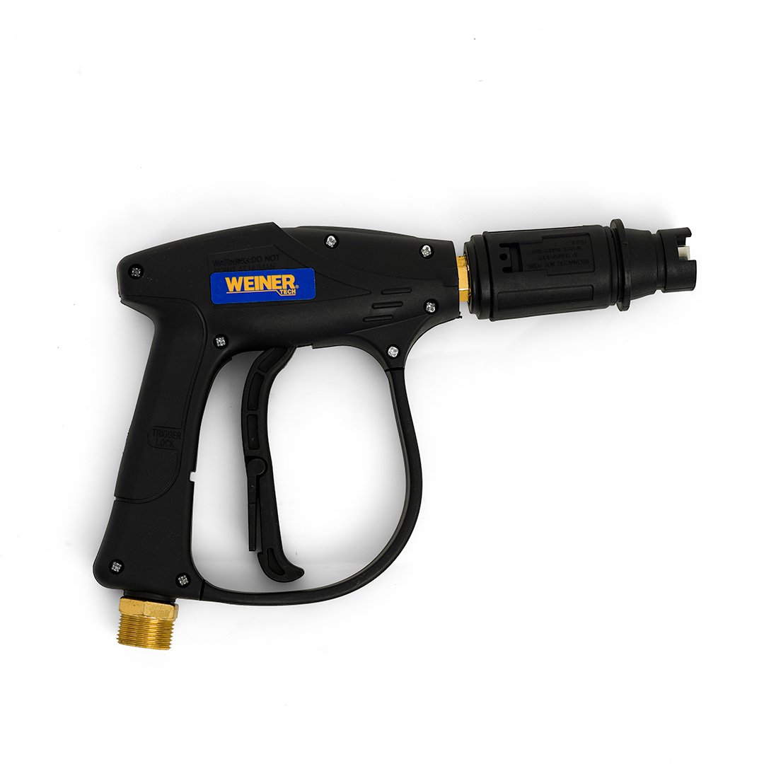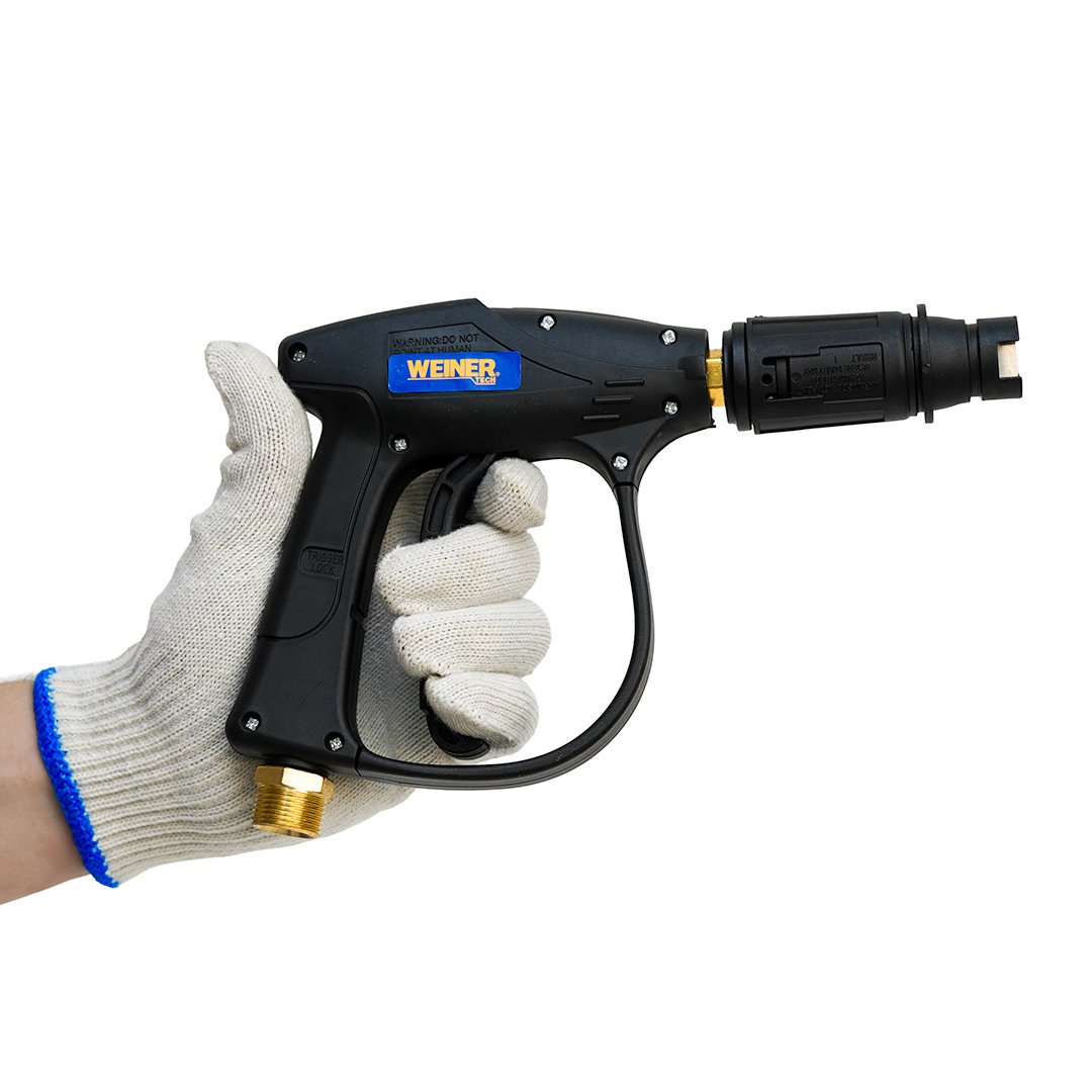 The WEINER tech high-pressure washer gun delivers up to 120 Bar, engineered for efficient