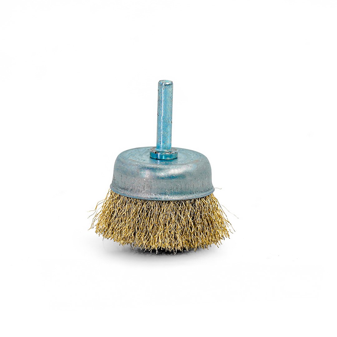 High-quality yellow drill cup brush available in multiple sizes for rust and paint removal, suitable for metal and wood surfaces.